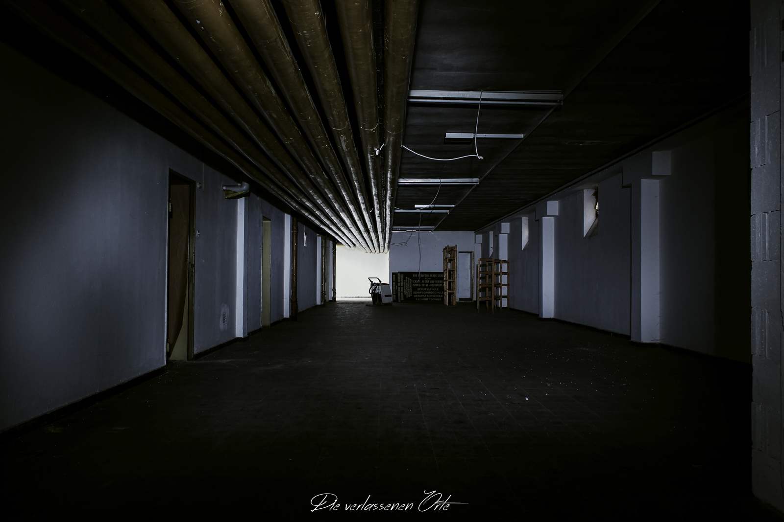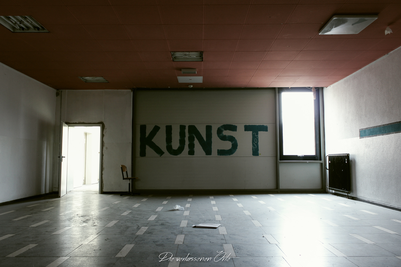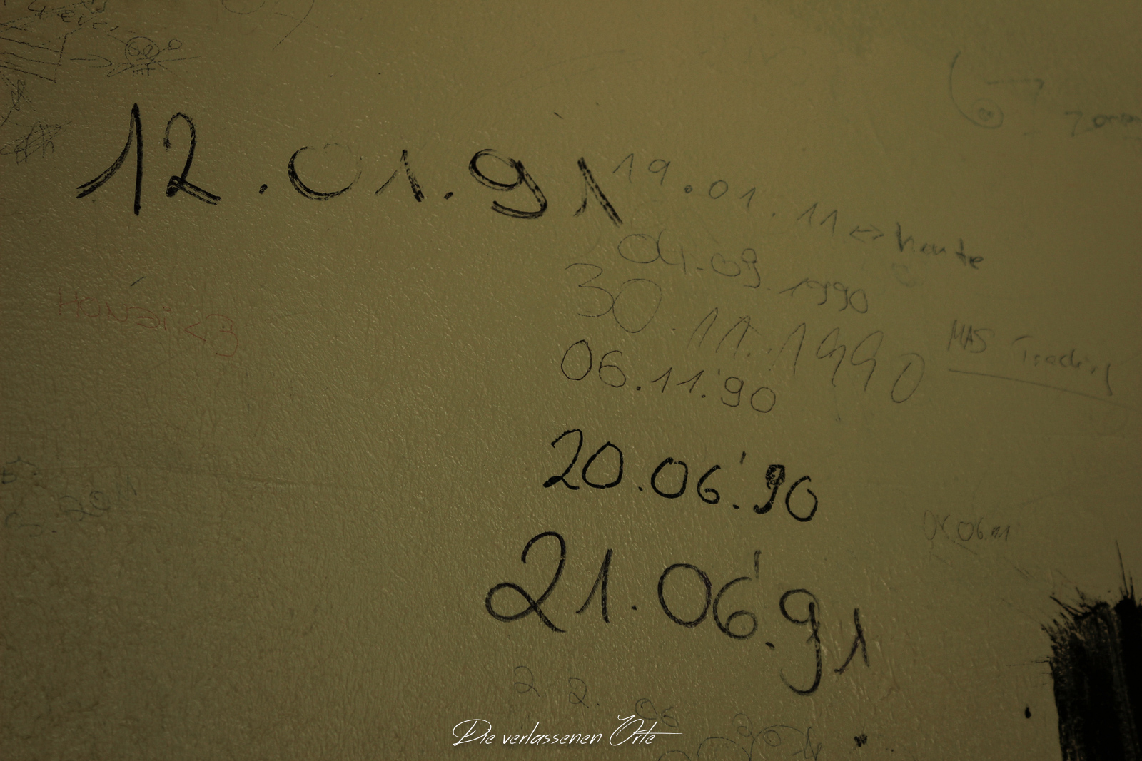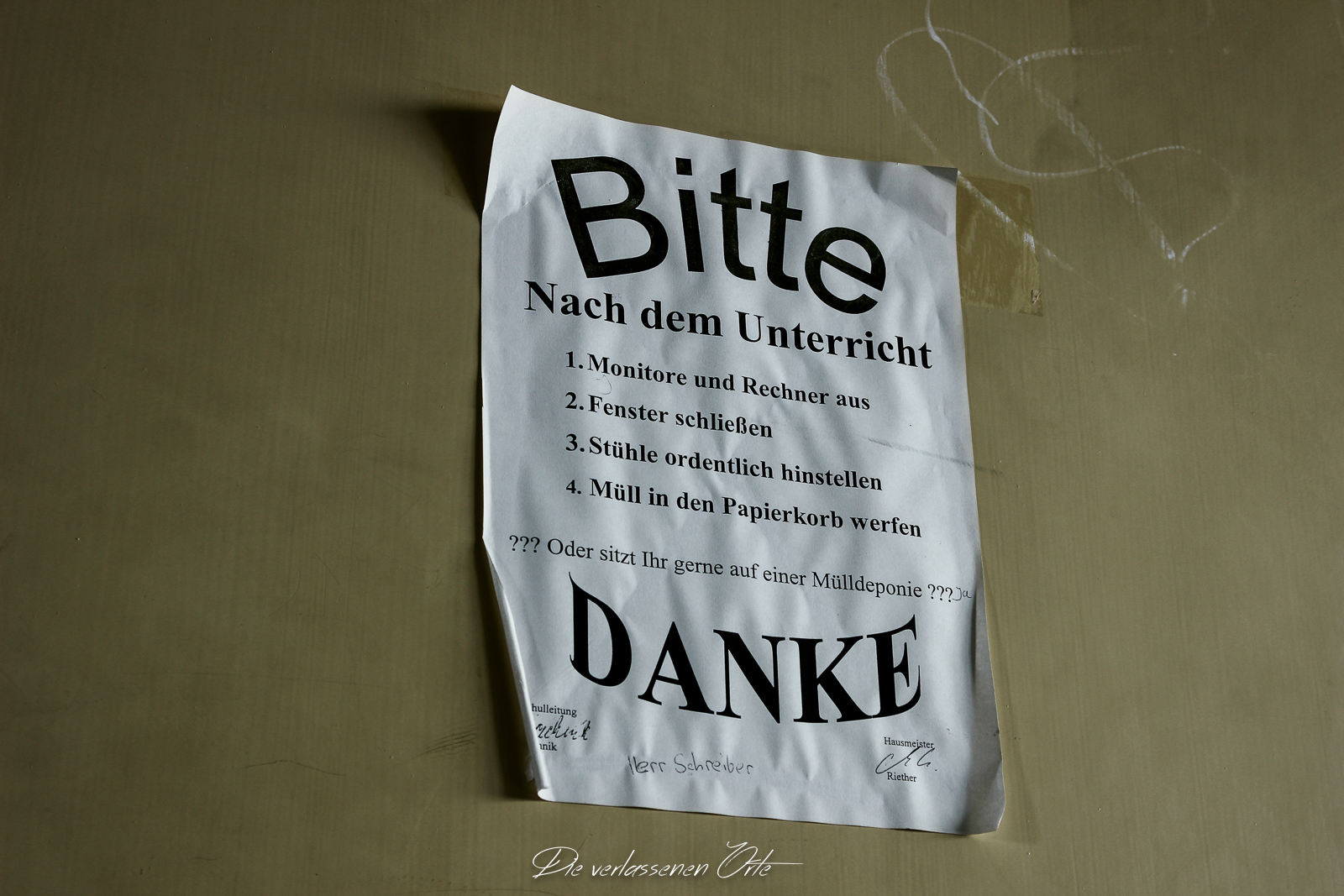 Ich blicke vom Display der Kamera wieder hoch. Nein, alles nur Illusion. Denn es ist still. Absolut still. Das noch mit Strom versorgte Notausgangsschild flackert. Der Zustand dieser Schule ist so beeindrucken gut…da denke ich gerne an meine eigene Schulzeit zurück. Die Schmierereien an der Wand holen mich aus den Gedanken zurück. 1991 lese ich. Das ist schon eine Weile her. An der Tafel stehen immer noch Unterrichtsinhalte. Wahnsinn. Diese Schule ist wirklich sehenswert.