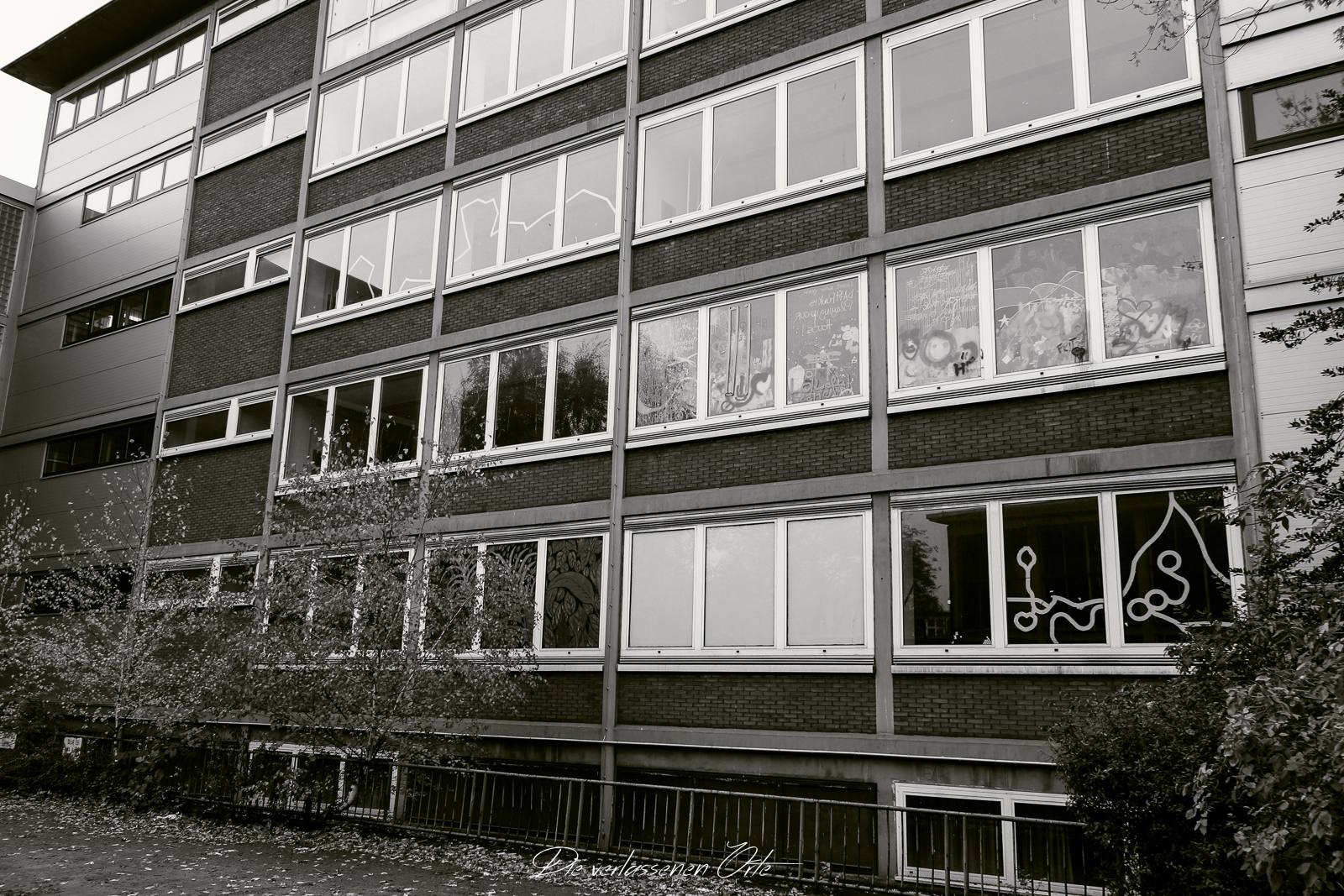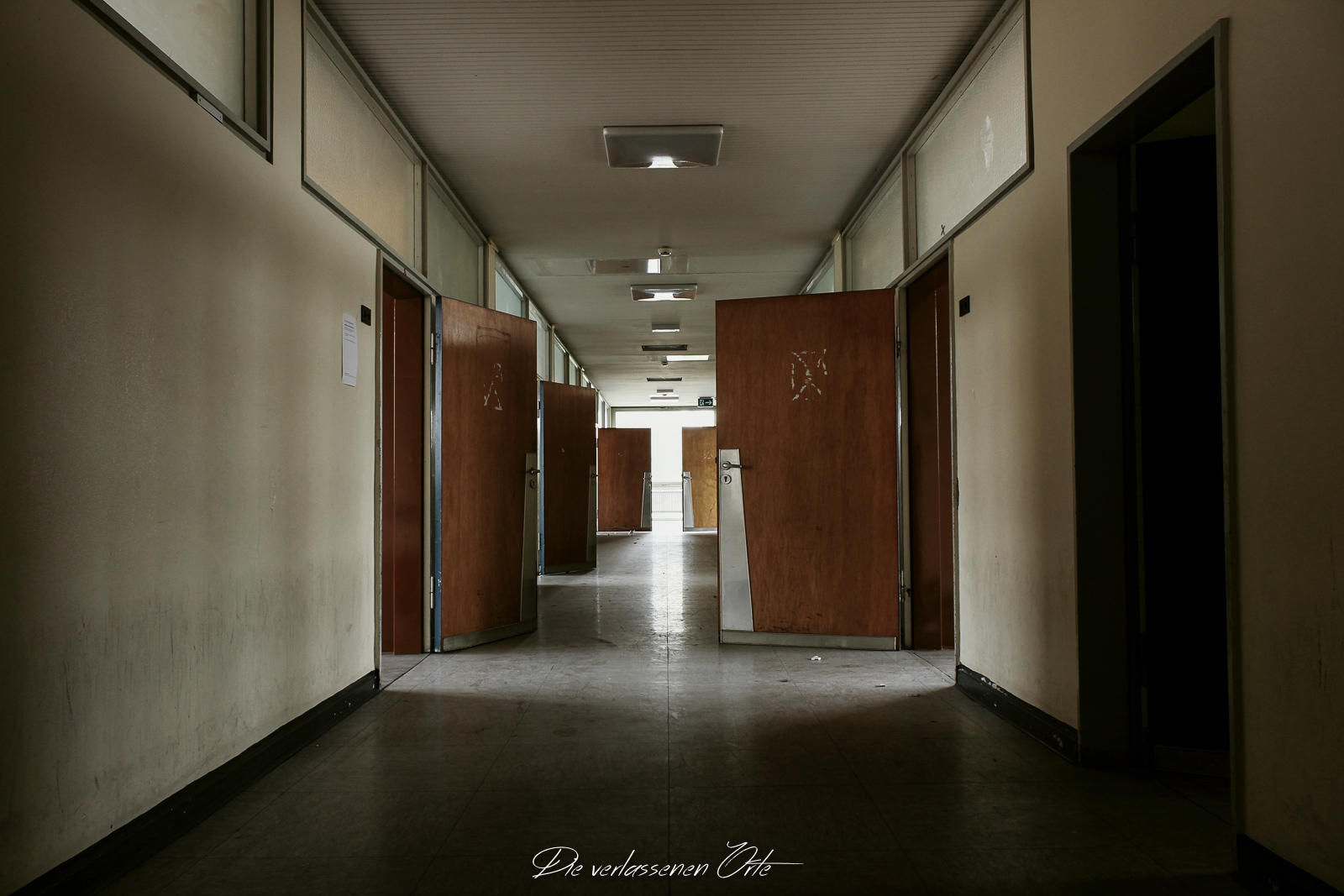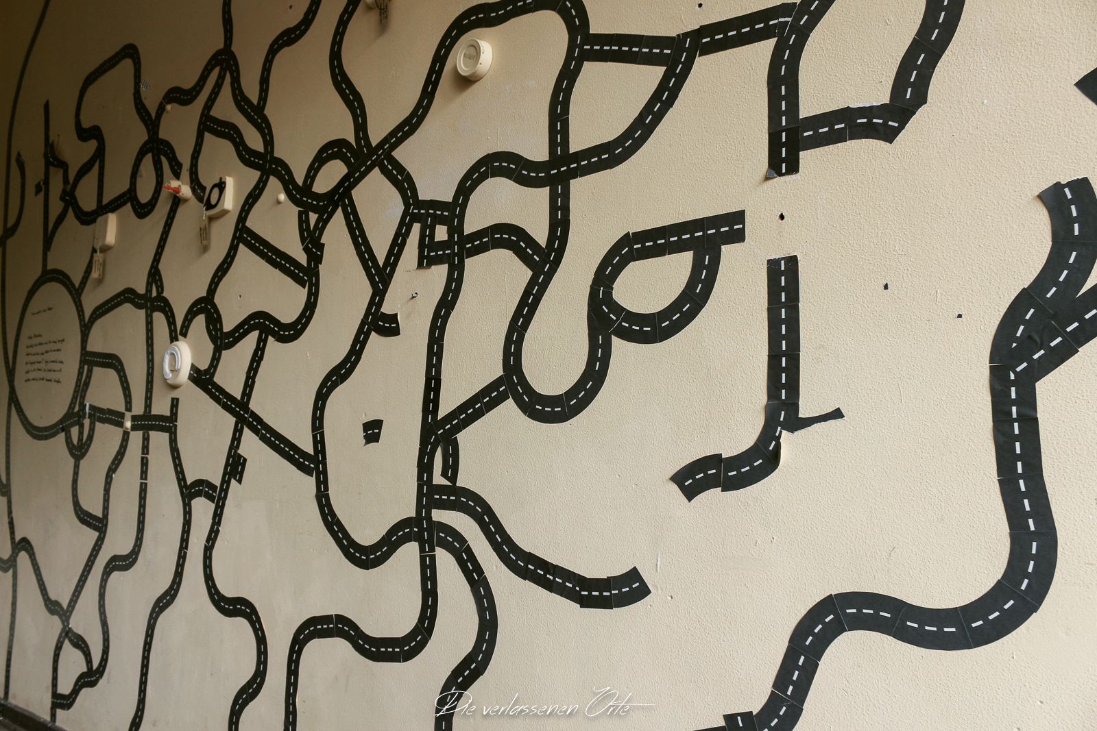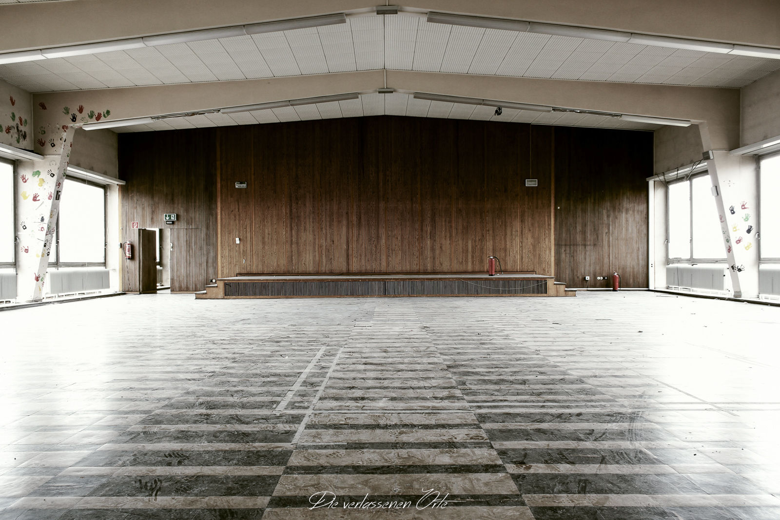 Ich blicke vom Display der Kamera wieder hoch. Nein, alles nur Illusion. Denn es ist still. Absolut still. Das noch mit Strom versorgte Notausgangsschild flackert. Der Zustand dieser Schule ist so beeindrucken gut…da denke ich gerne an meine eigene Schulzeit zurück. Die Schmierereien an der Wand holen mich aus den Gedanken zurück. 1991 lese ich. Das ist schon eine Weile her. An der Tafel stehen immer noch Unterrichtsinhalte. Wahnsinn. Diese Schule ist wirklich sehenswert.