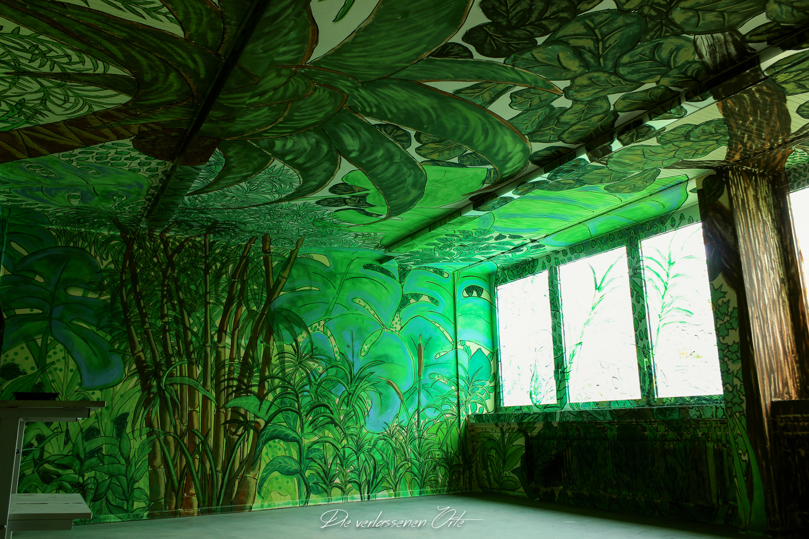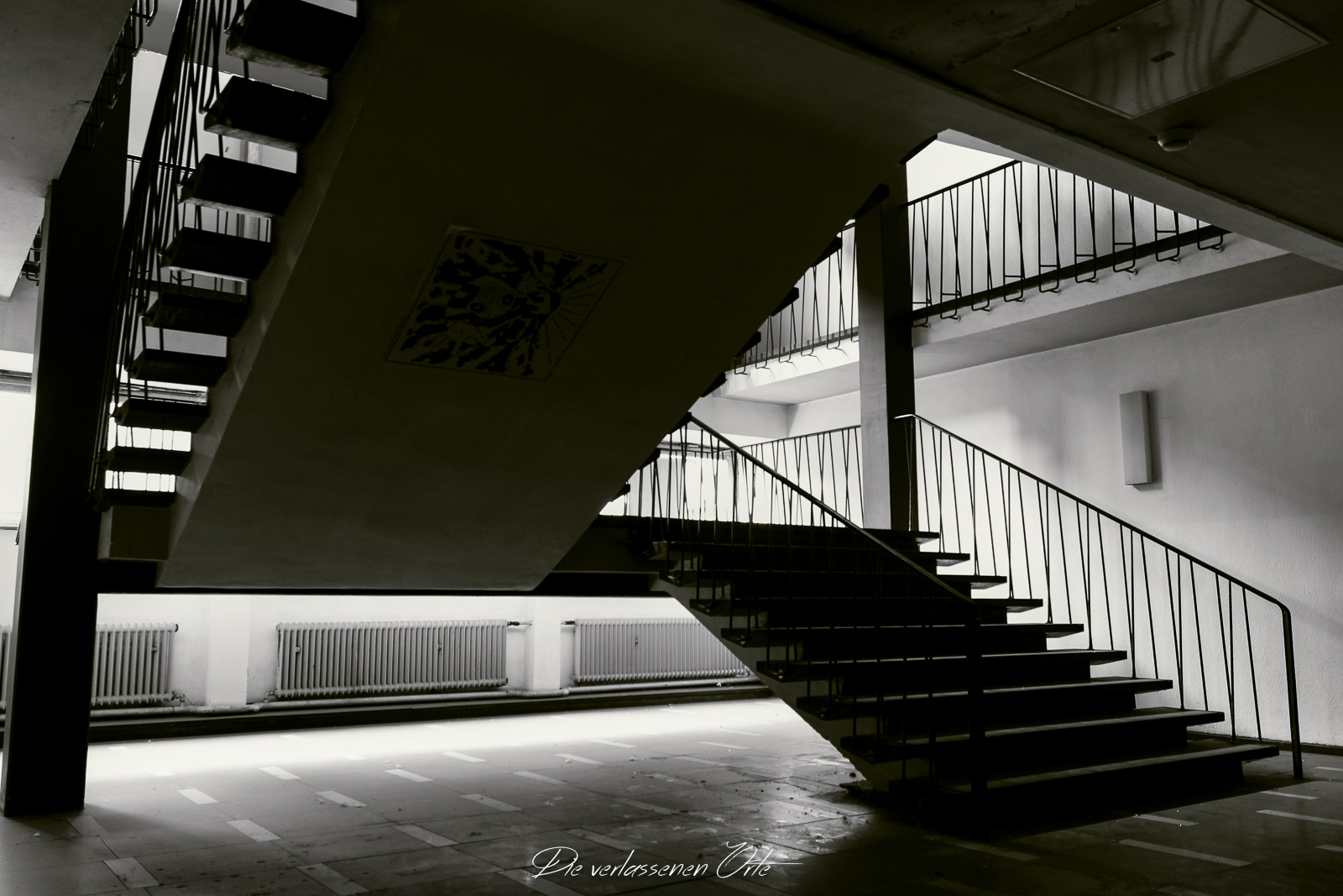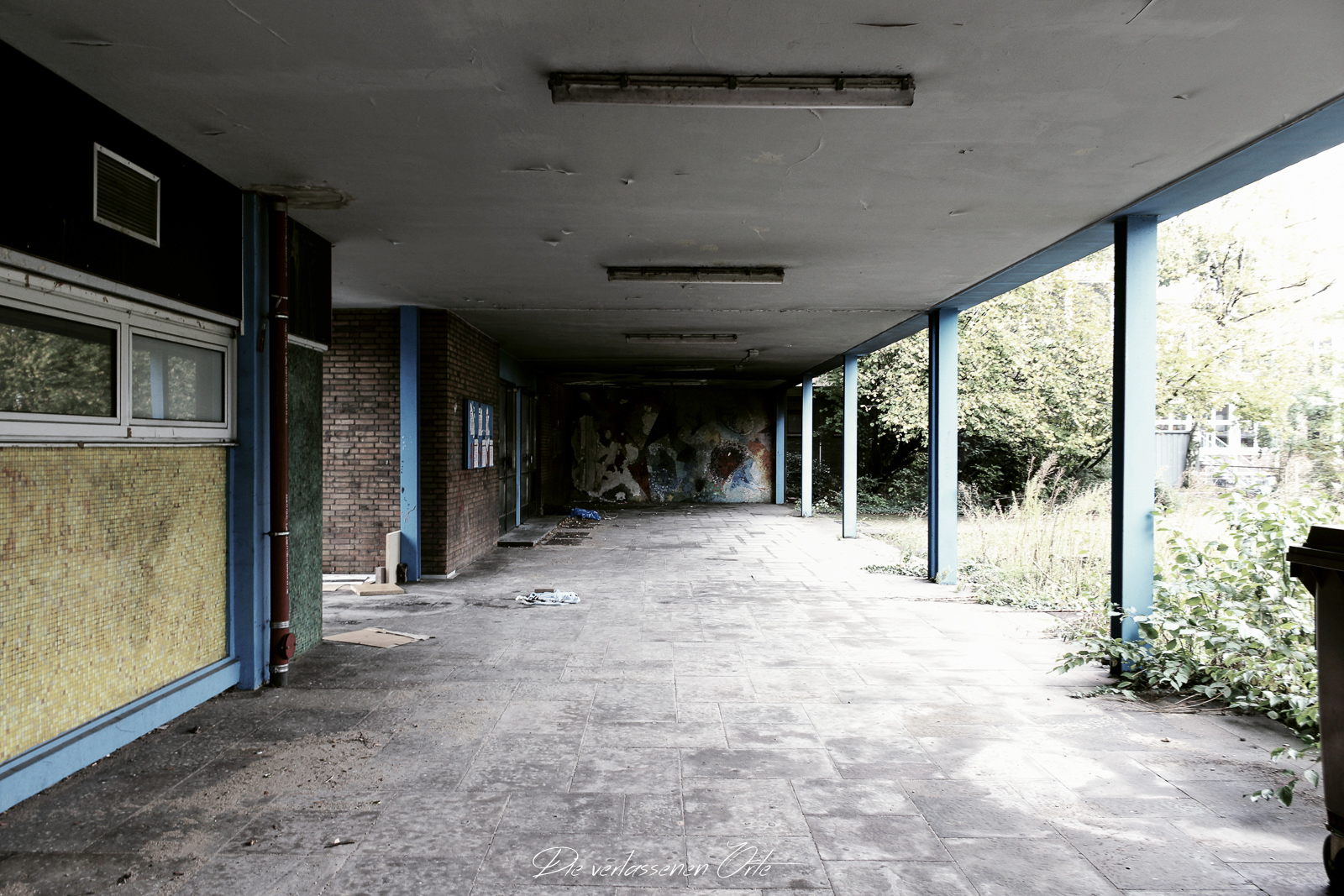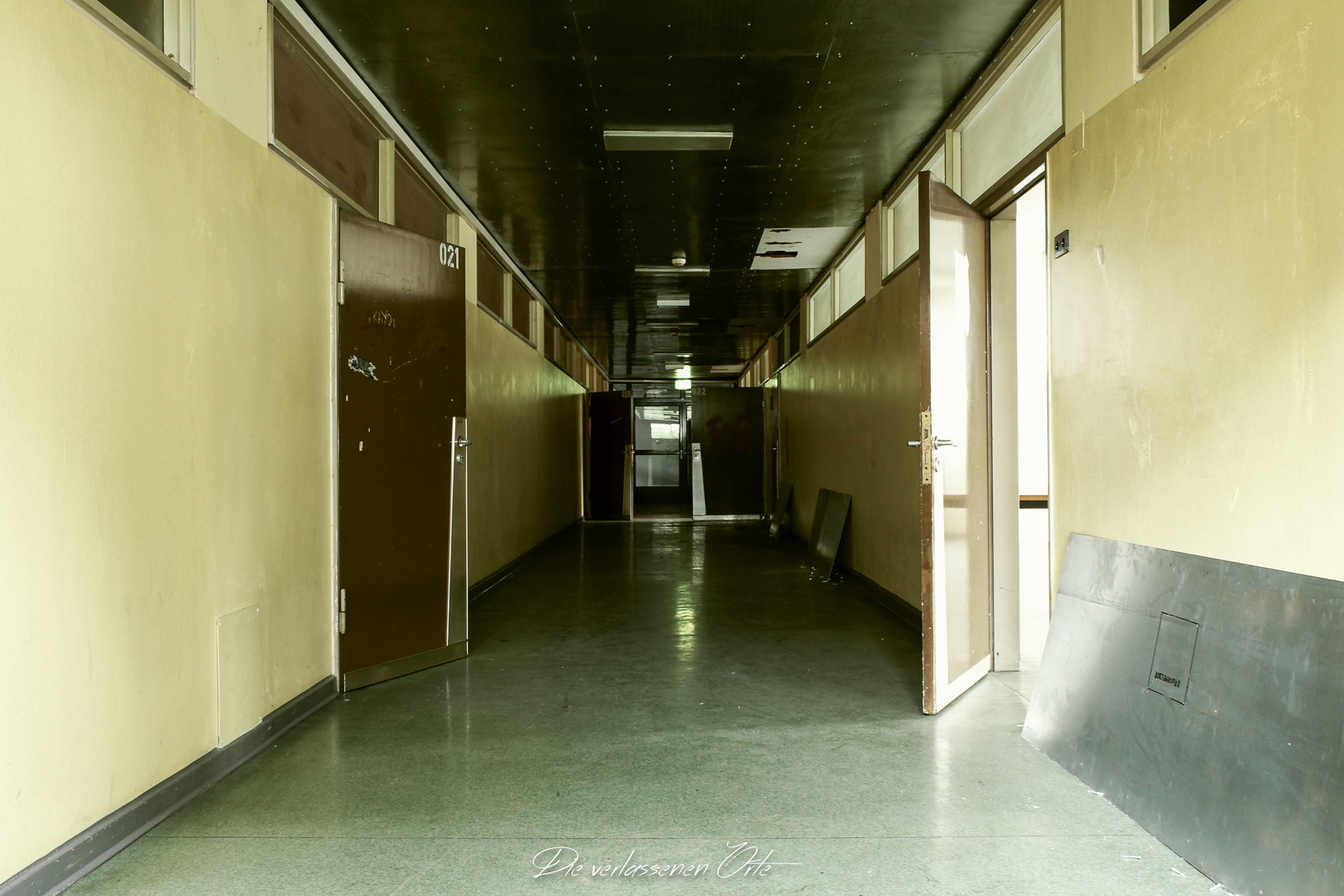 Ich blicke vom Display der Kamera wieder hoch. Nein, alles nur Illusion. Denn es ist still. Absolut still. Das noch mit Strom versorgte Notausgangsschild flackert. Der Zustand dieser Schule ist so beeindrucken gut…da denke ich gerne an meine eigene Schulzeit zurück. Die Schmierereien an der Wand holen mich aus den Gedanken zurück. 1991 lese ich. Das ist schon eine Weile her. An der Tafel stehen immer noch Unterrichtsinhalte. Wahnsinn. Diese Schule ist wirklich sehenswert.